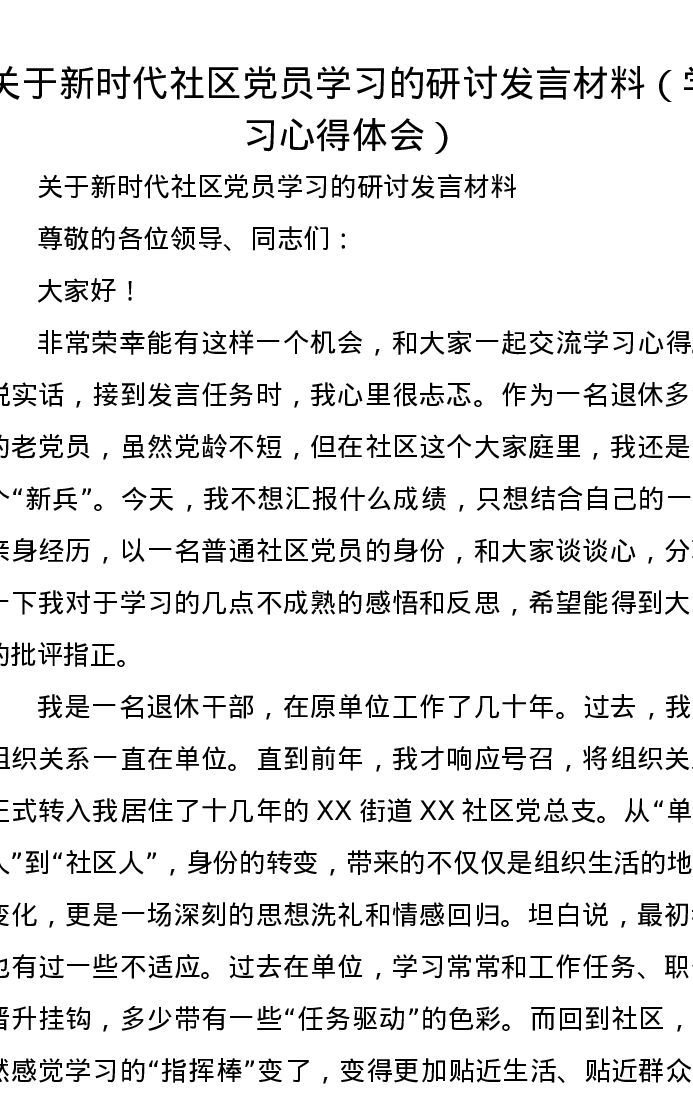 关于新时代社区党员学习的研讨发言材料(学习心得体会)