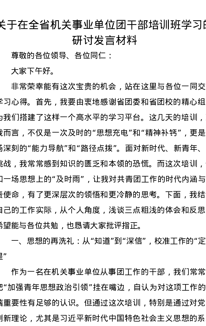 关于在全省机关事业单位团干部培训班学习的研讨发言材料