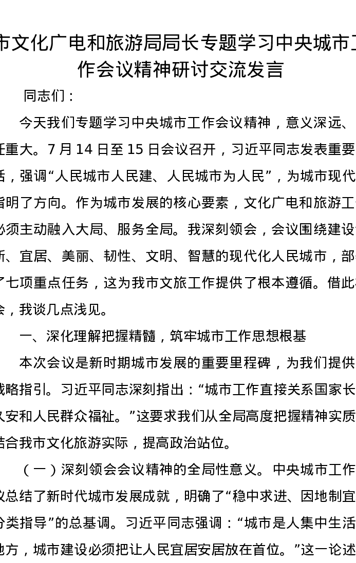 市文化广电和旅游局局长专题学习中央城市工作会议精神研讨交流发言