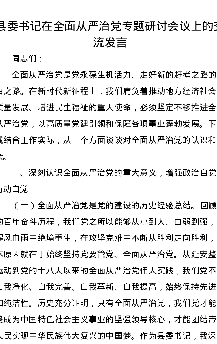 县委书记在全面从严治党专题研讨会议上的交流发言