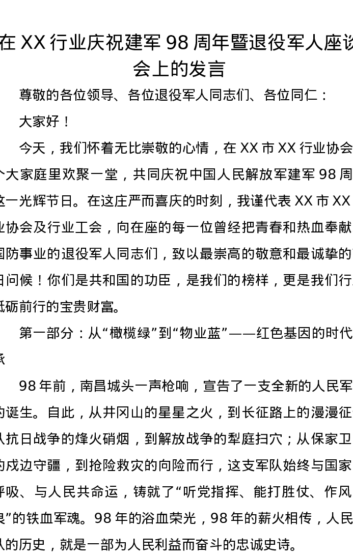 在XX行业庆祝建军98周年暨退役军人座谈会上的发言
