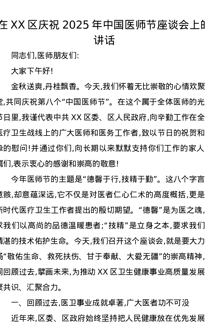 在XX区庆祝2025年中国医师节座谈会上的讲话