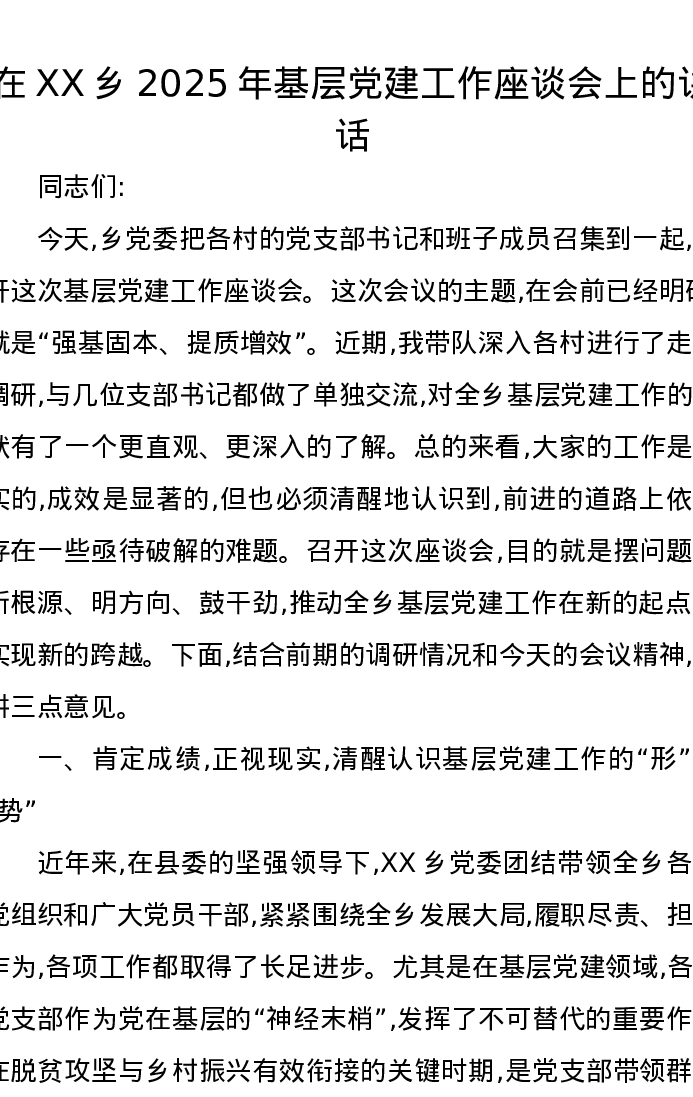 在XX乡2025年基层党建工作座谈会上的讲话