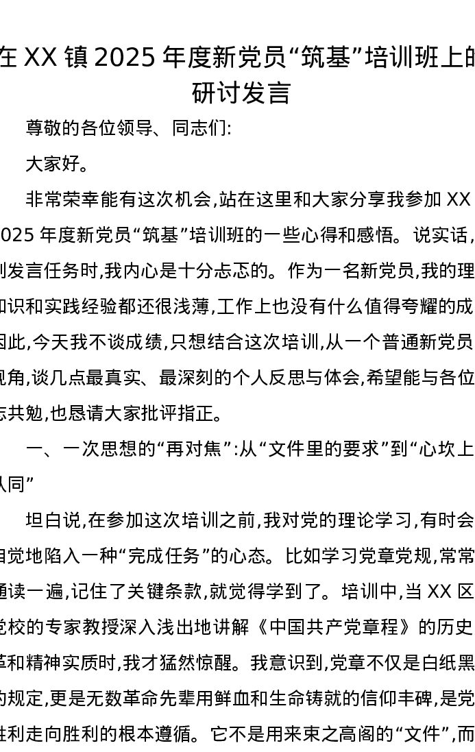在XX镇2025年度新党员“筑基”培训班上的研讨发言