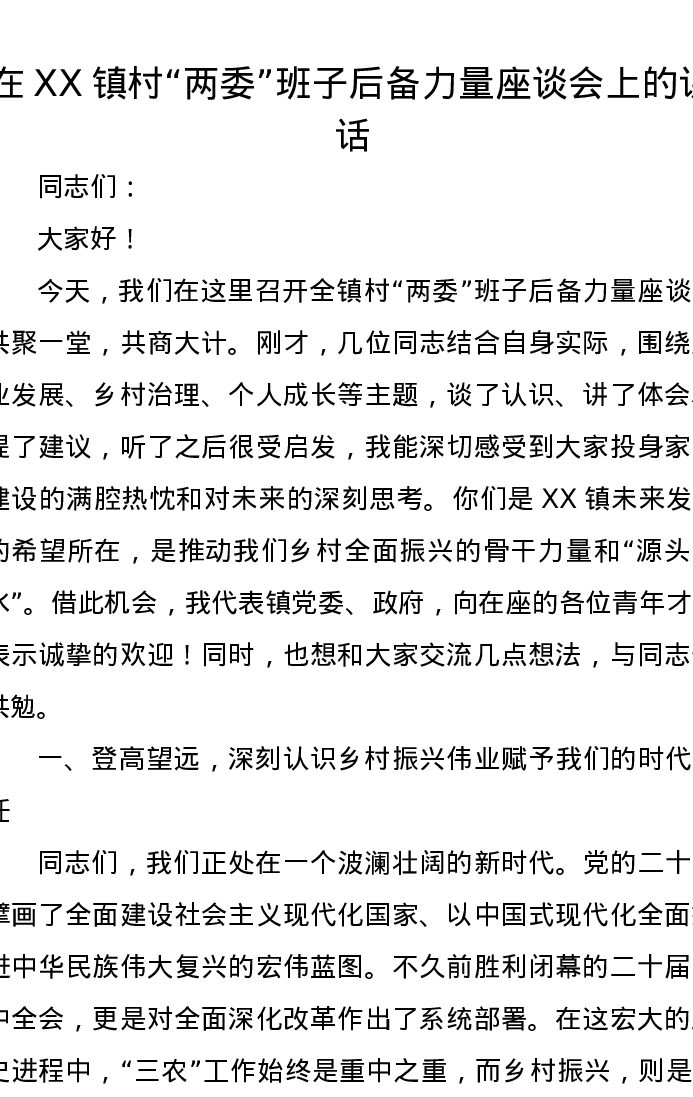 在XX镇村“两委”班子后备力量座谈会上的讲话
