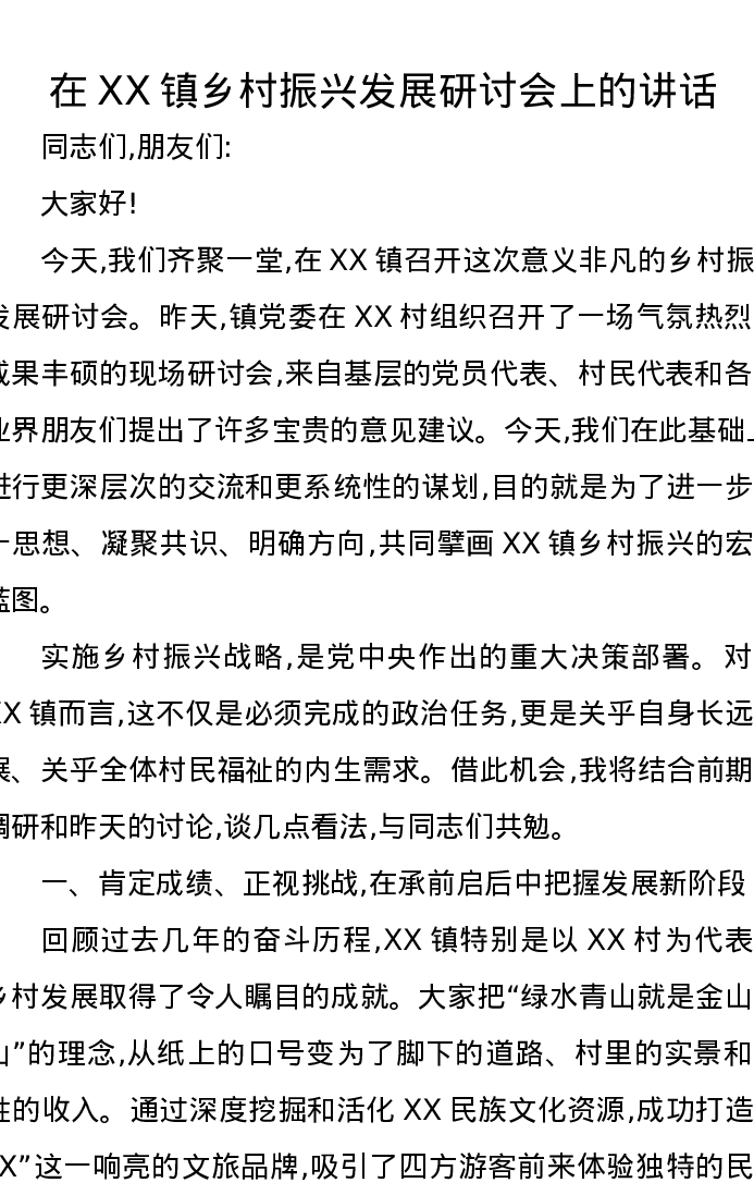 在XX镇乡村振兴发展研讨会上的讲话