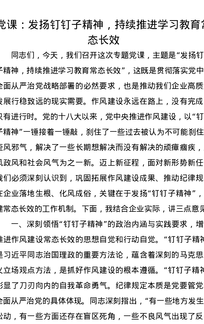 党课讲稿:发扬钉钉子精神,持续推进学习教育常态长效