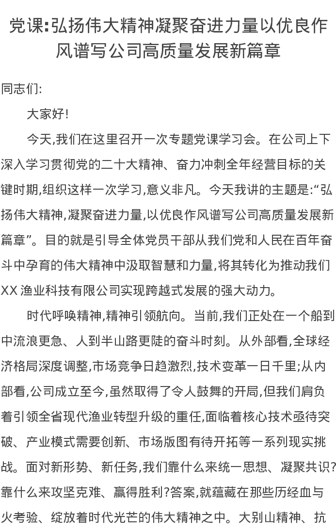党课讲稿:弘扬伟大精神凝聚奋进力量以优良作风谱写公司高质量发展新篇章