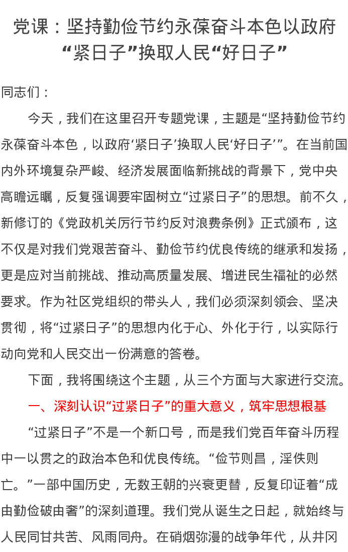 党课讲稿:坚持勤俭节约永葆奋斗本色以政府“紧日子”换取人民“好日子”