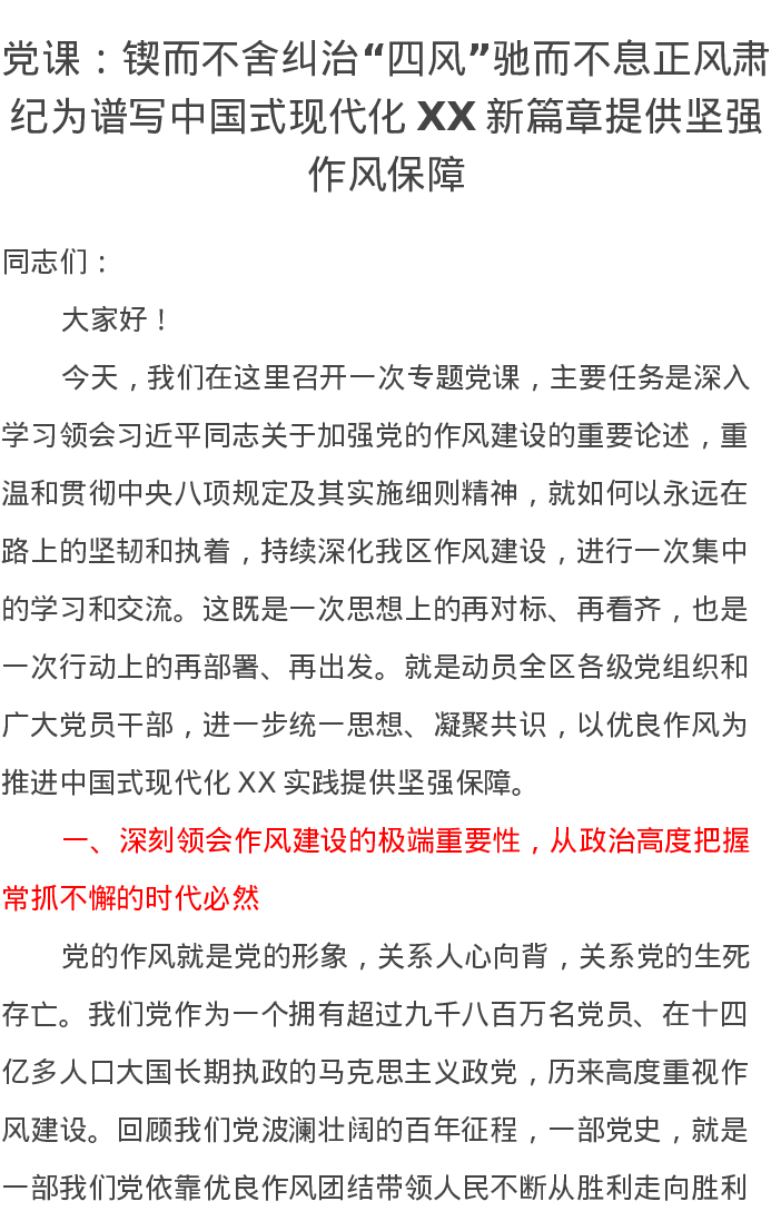 党课讲稿:锲而不舍纠治“四风”驰而不息正风肃纪为谱写中国式现代化XX新篇章提供坚强作风保障