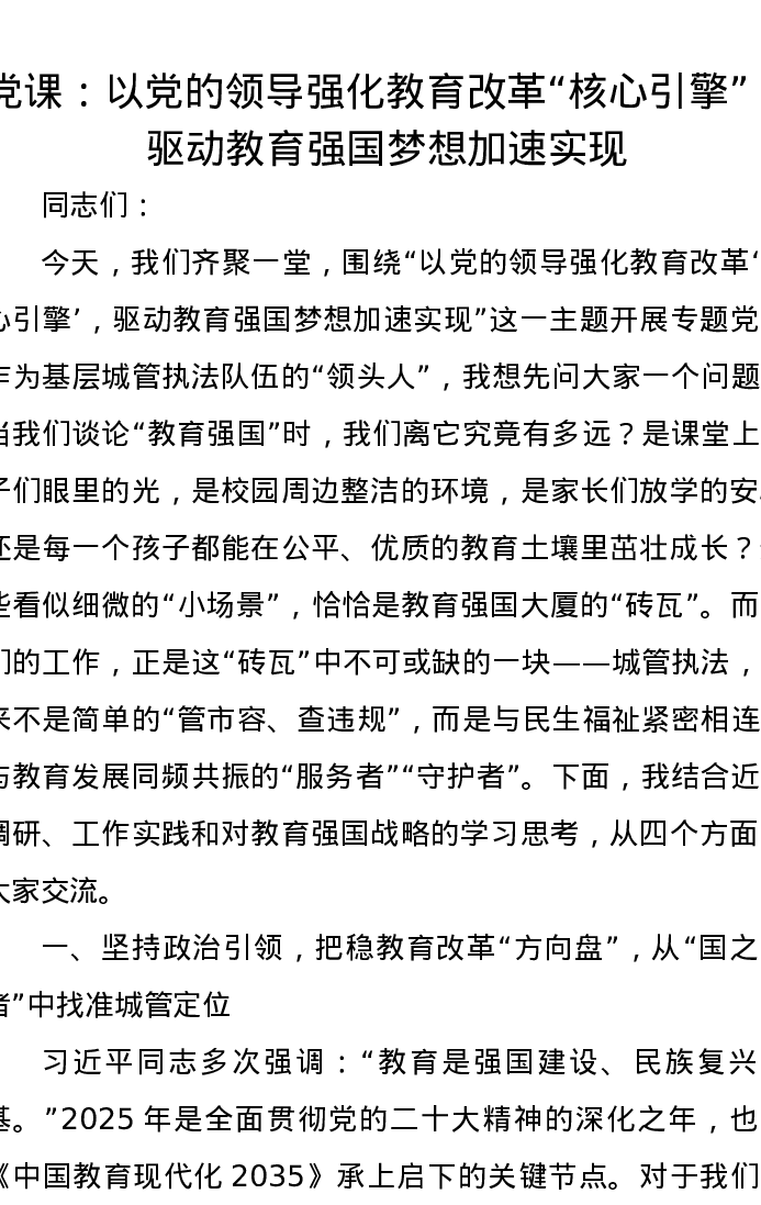 党课讲稿:以党的领导强化教育改革“核心引擎”,驱动教育强国梦想加速实现