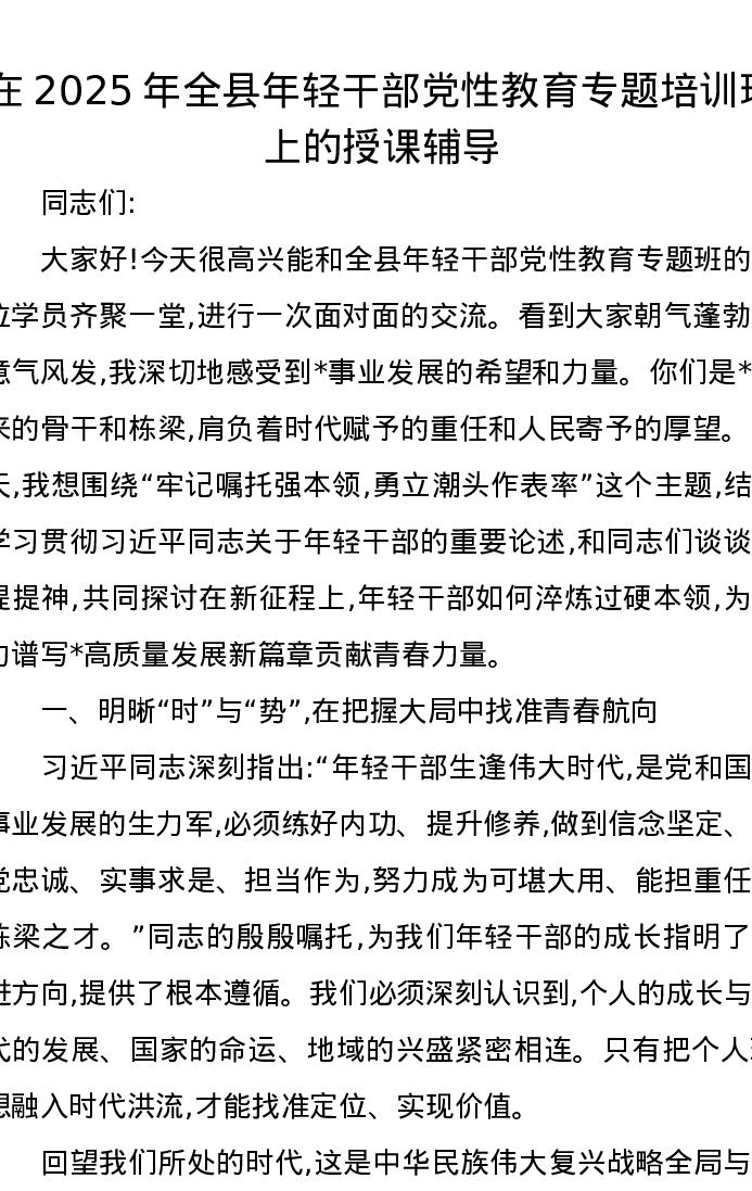 在2025年全县年轻干部党性教育专题培训班上的授课辅导