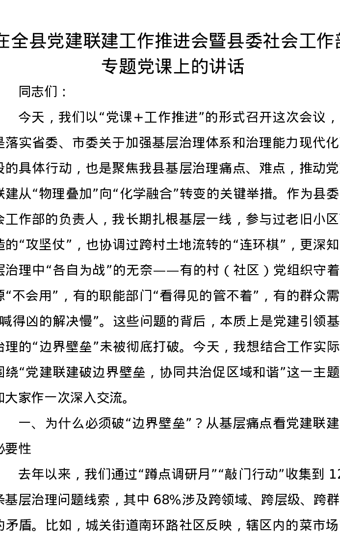 在全县党建联建工作推进会暨县委社会工作部专题党课上的讲话