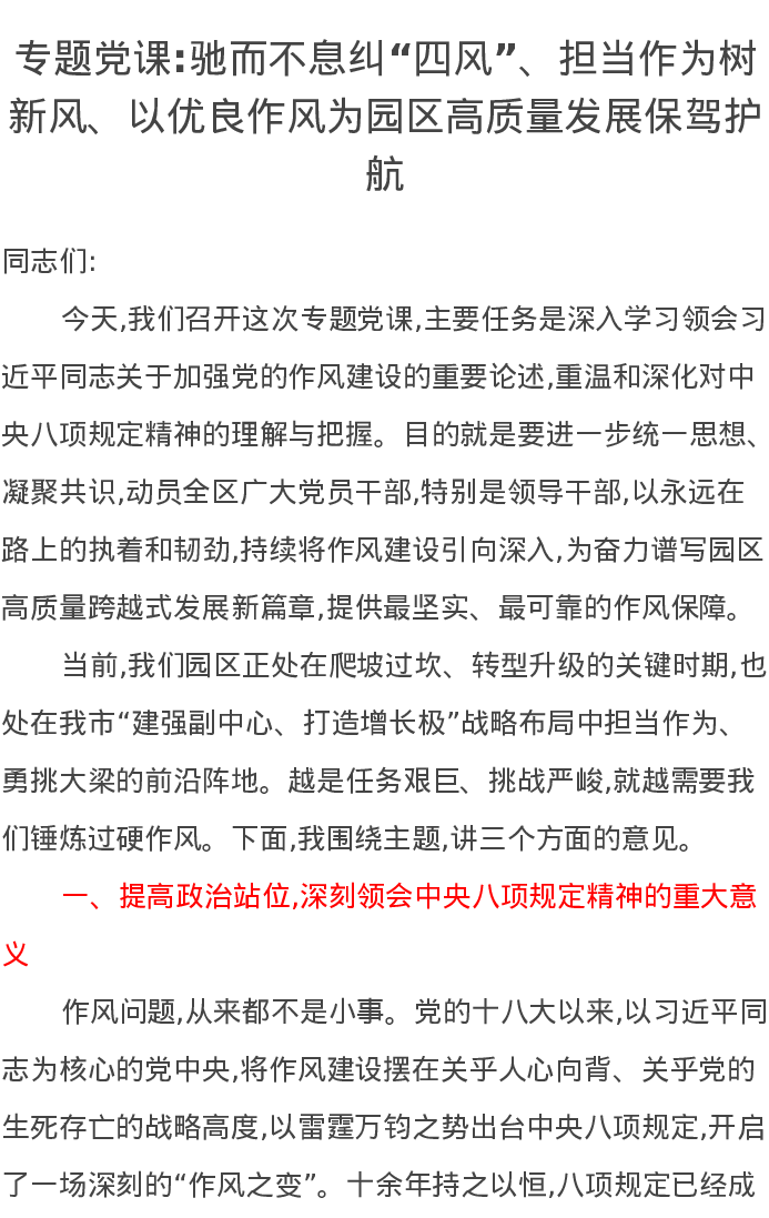 专题党课驰而不息纠“四风”、担当作为树新风、以优良作风为园区高质量发展保驾护航