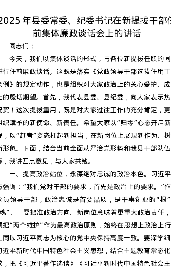 2025年县委常委、纪委书记在新提拔干部任前集体廉政谈话会上的讲话