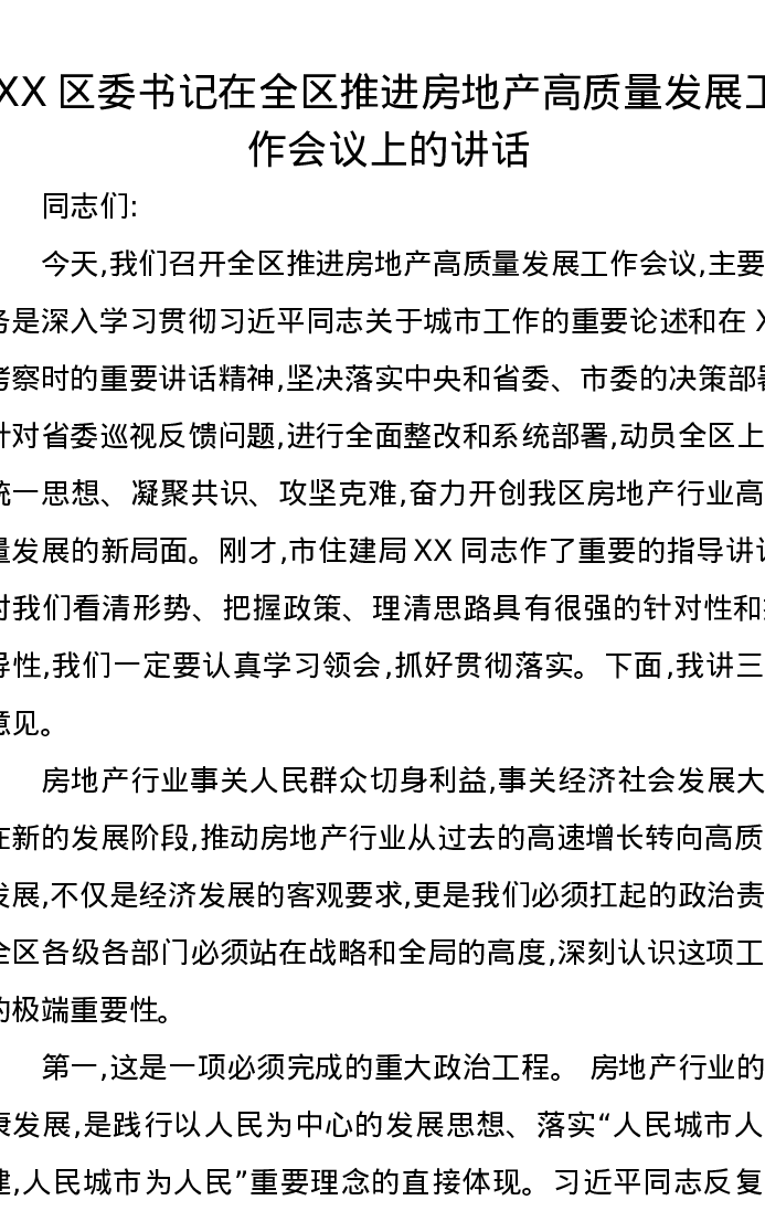 XX区委书记在全区推进房地产高质量发展工作会议上的讲话