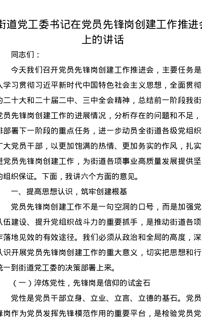 街道党工委书记在党员先锋岗创建工作推进会上的讲话