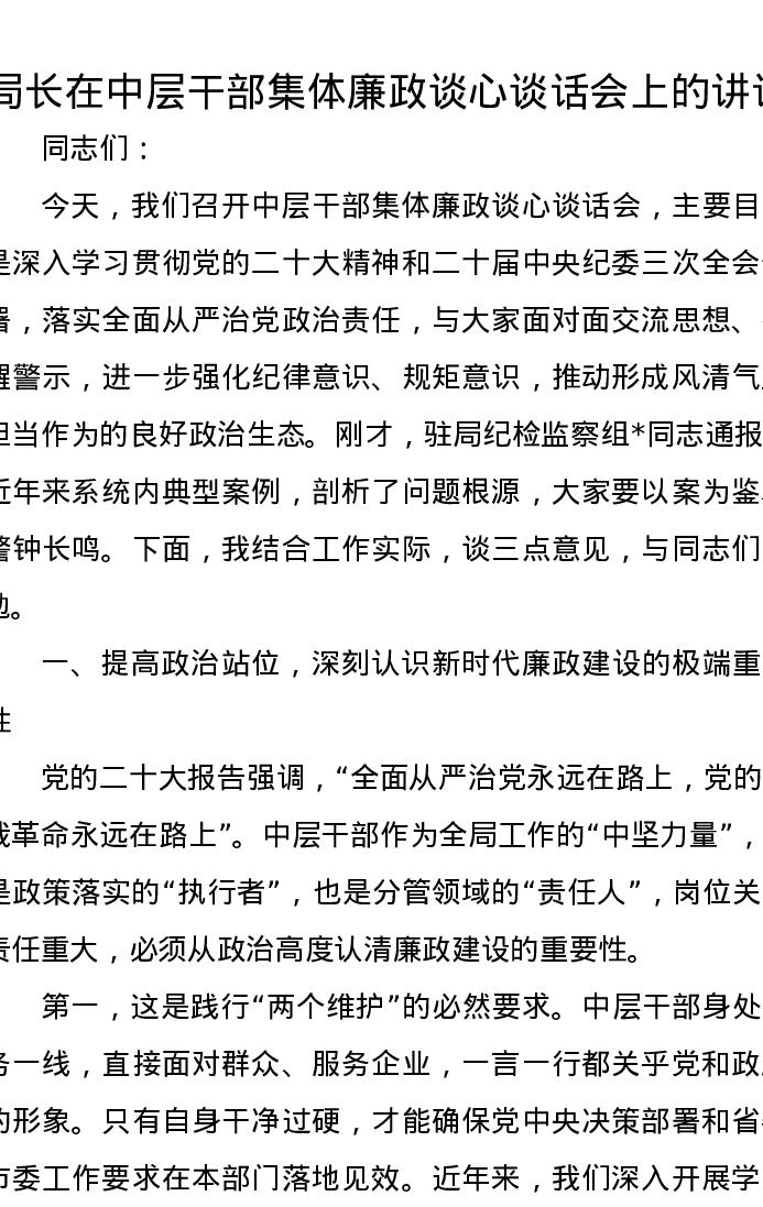 局长在中层干部集体廉政谈心谈话会上的讲话