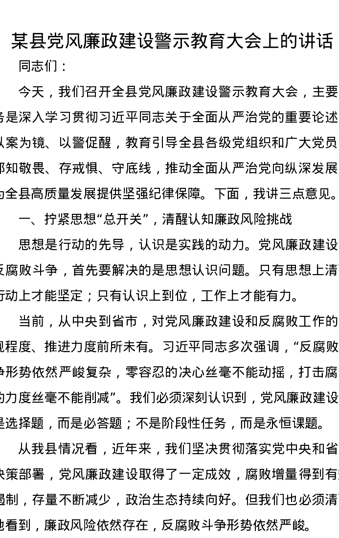 某县党风廉政建设警示教育大会上的讲话