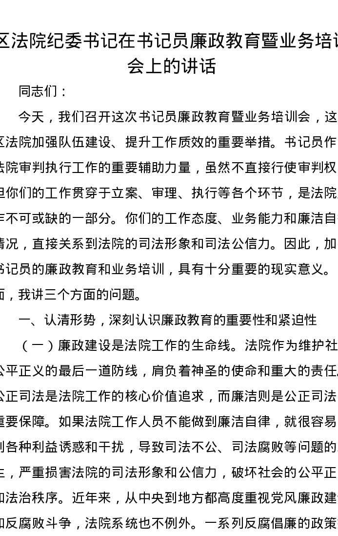 区法院纪委书记在书记员廉政教育暨业务培训会上的讲话