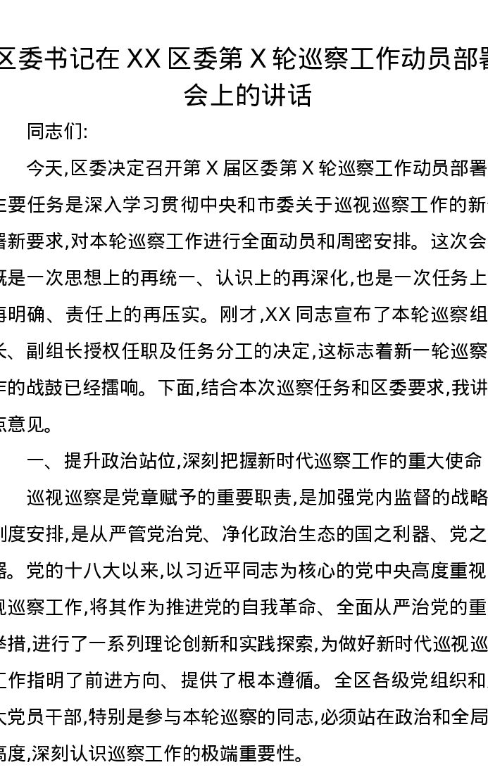 区委书记在XX区委第X轮巡察工作动员部署会上的讲话