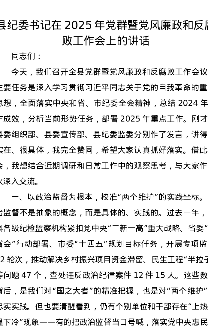 县纪委书记在2025年党群暨党风廉政和反腐败工作会上的讲话