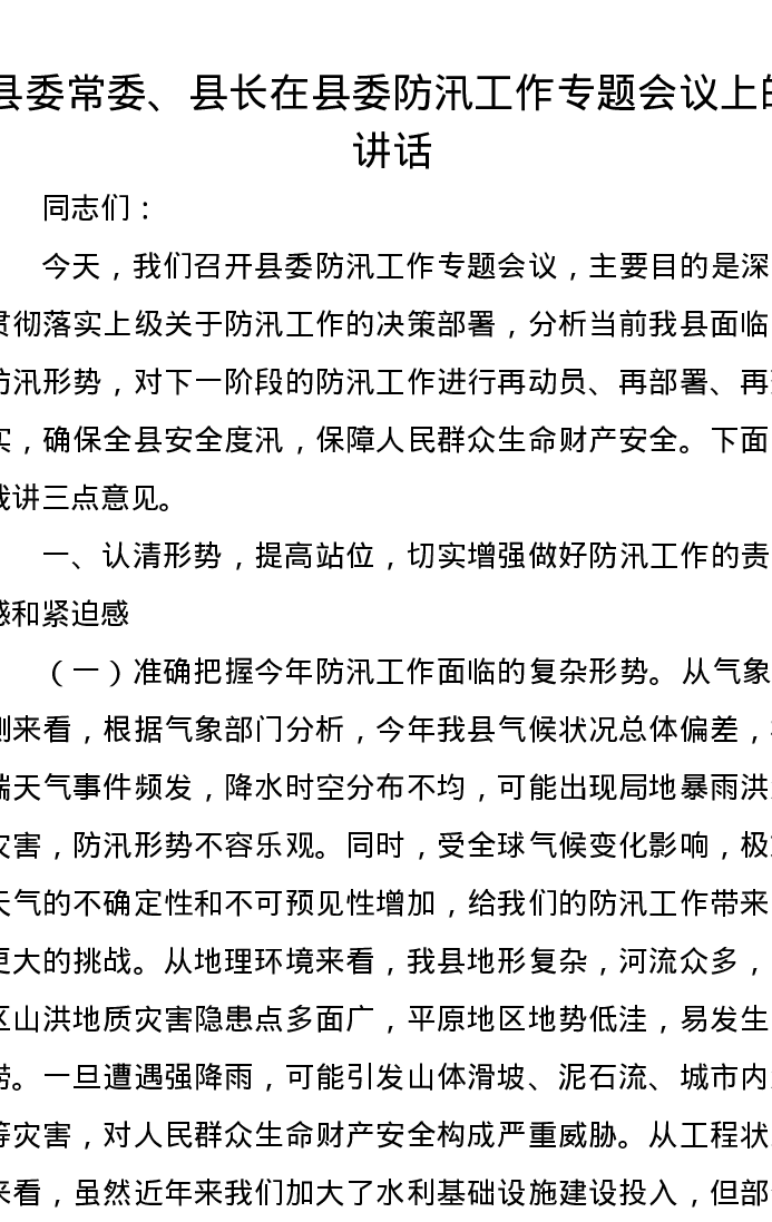 县委常委、县长在县委防汛工作专题会议上的讲话