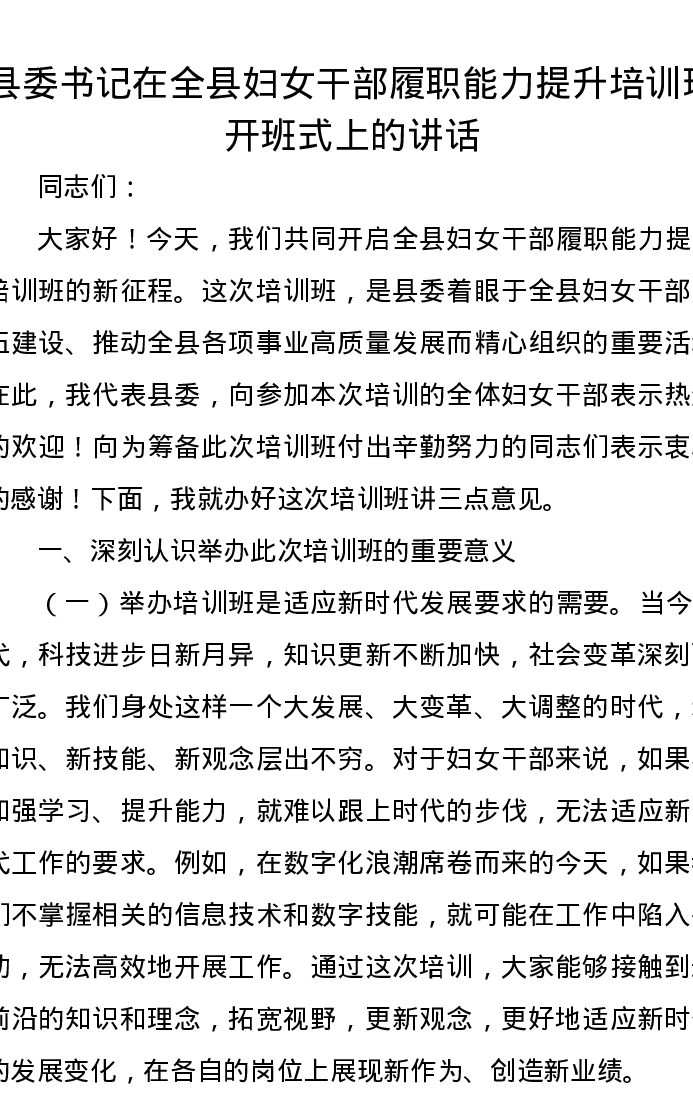 县委书记在全县妇女干部履职能力提升培训班开班式上的讲话