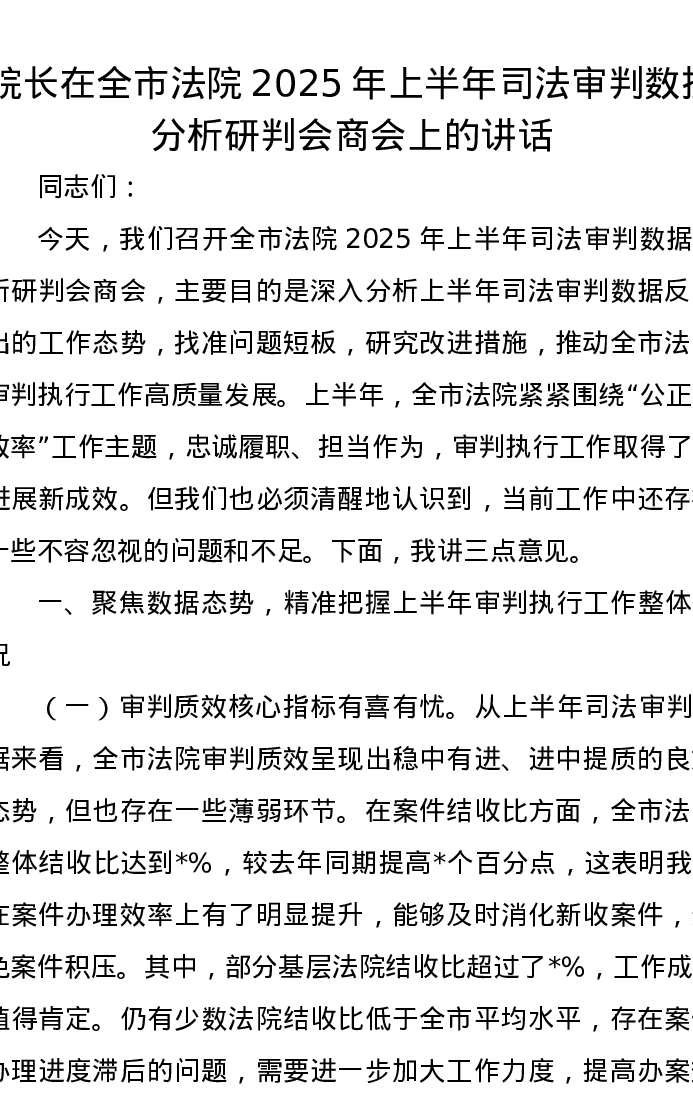 院长在全市法院2025年上半年司法审判数据分析研判会商会上的讲话