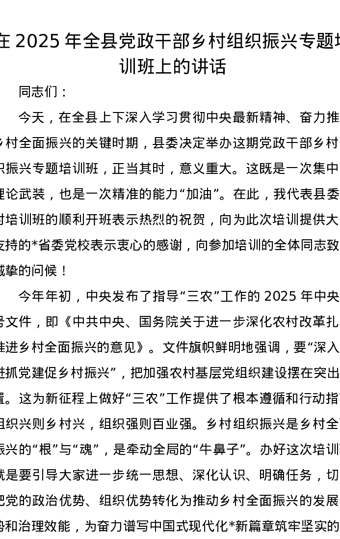 在2025年全县党政干部乡村组织振兴专题培训班上的讲话
