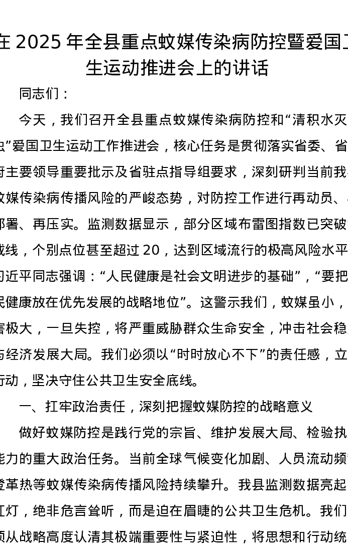在2025年全县重点蚊媒传染病防控暨爱国卫生运动推进会上的讲话