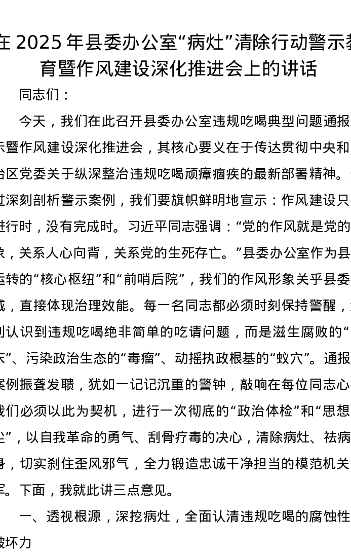 在2025年县委办公室“病灶”清除行动警示教育暨作风建设深化推进会上的讲话