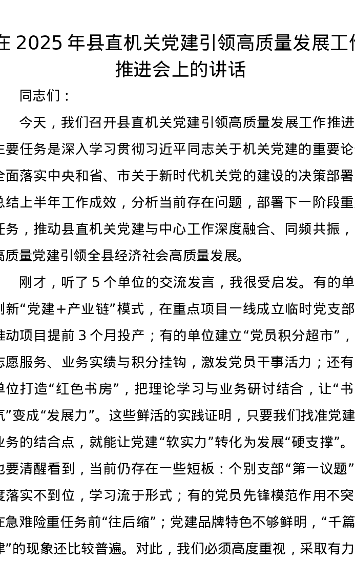 在2025年县直机关党建引领高质量发展工作推进会上的讲话