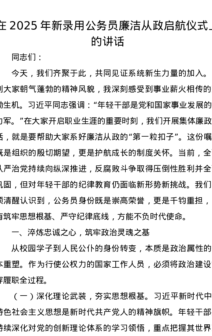 在2025年新录用公务员廉洁从政启航仪式上的讲话