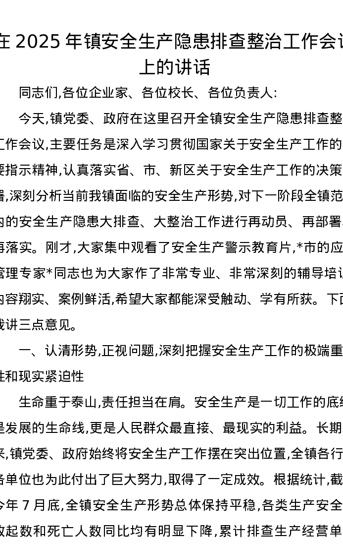 在2025年镇安全生产隐患排查整治工作会议上的讲话