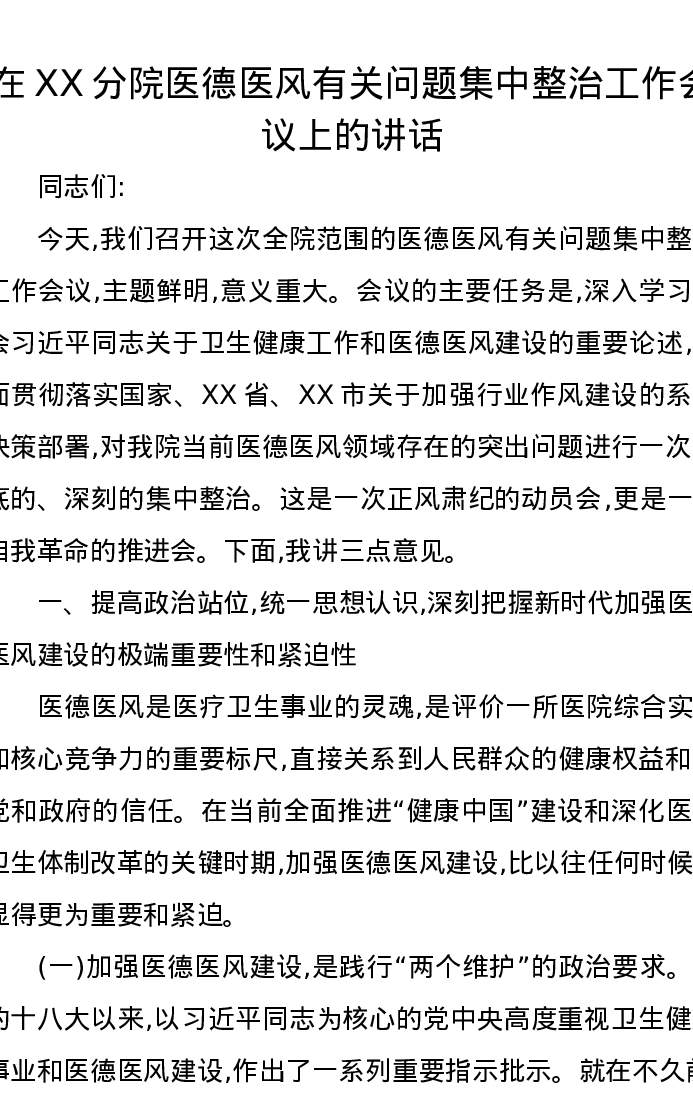 在XX分院医德医风有关问题集中整治工作会议上的讲话
