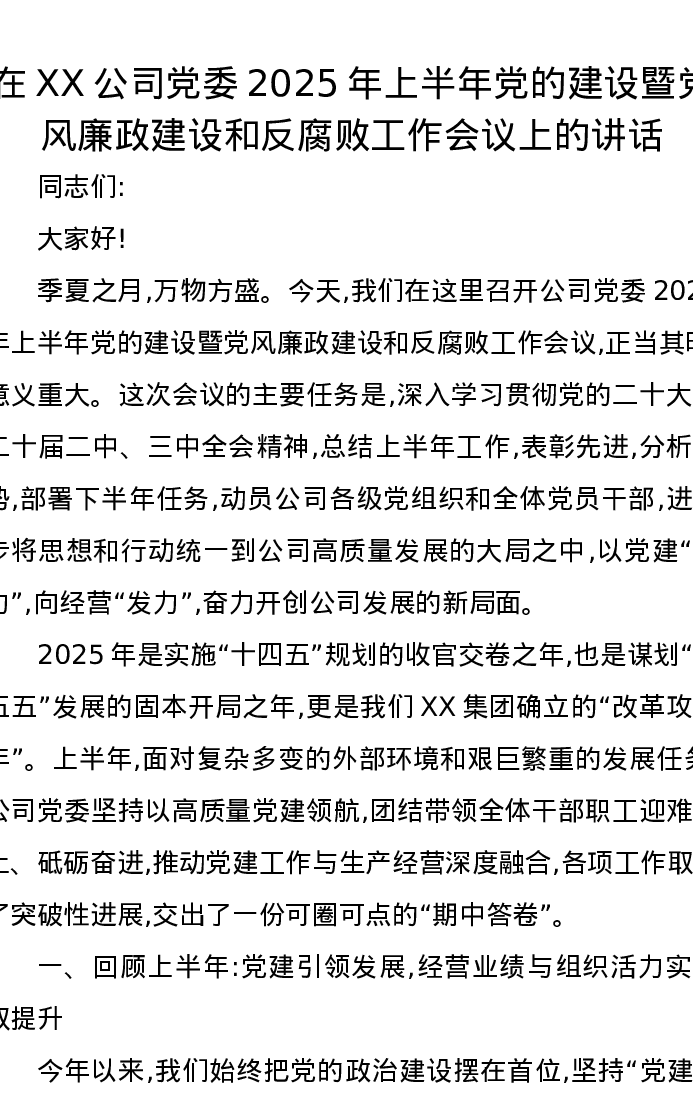 在XX公司党委2025年上半年党的建设暨党风廉政建设和反腐败工作会议上的讲话