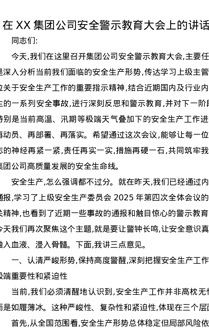 在XX集团公司安全警示教育大会上的讲话