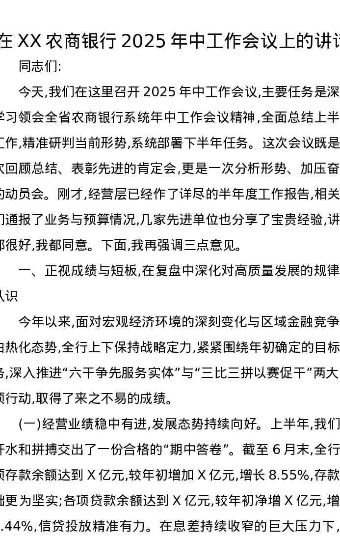 在XX农商银行2025年中工作会议上的讲话