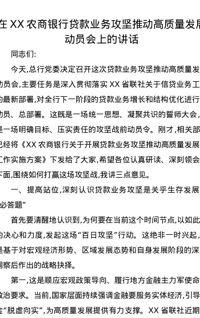 在XX农商银行贷款业务攻坚推动高质量发展动员会上的讲话