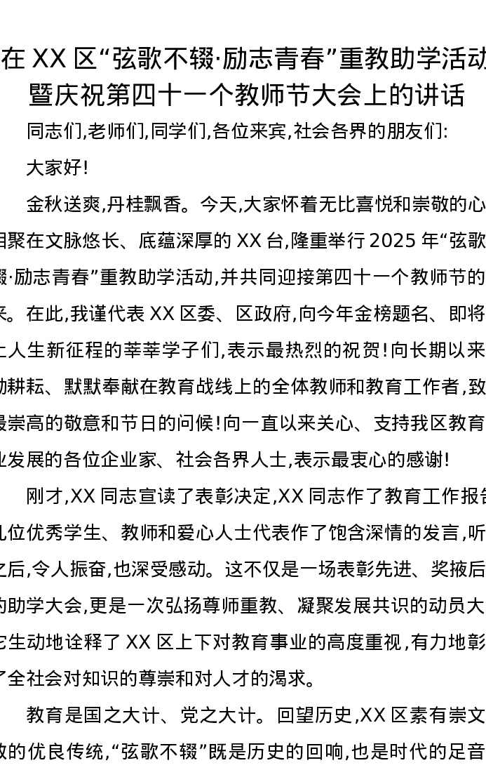 在XX区“弦歌不辍·励志青春”重教助学活动暨庆祝第四十一个教师节大会上的讲话