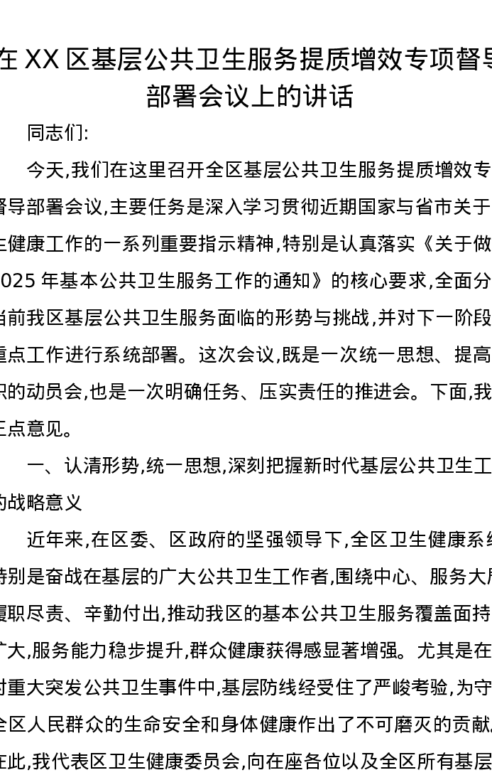 在XX区基层公共卫生服务提质增效专项督导部署会议上的讲话