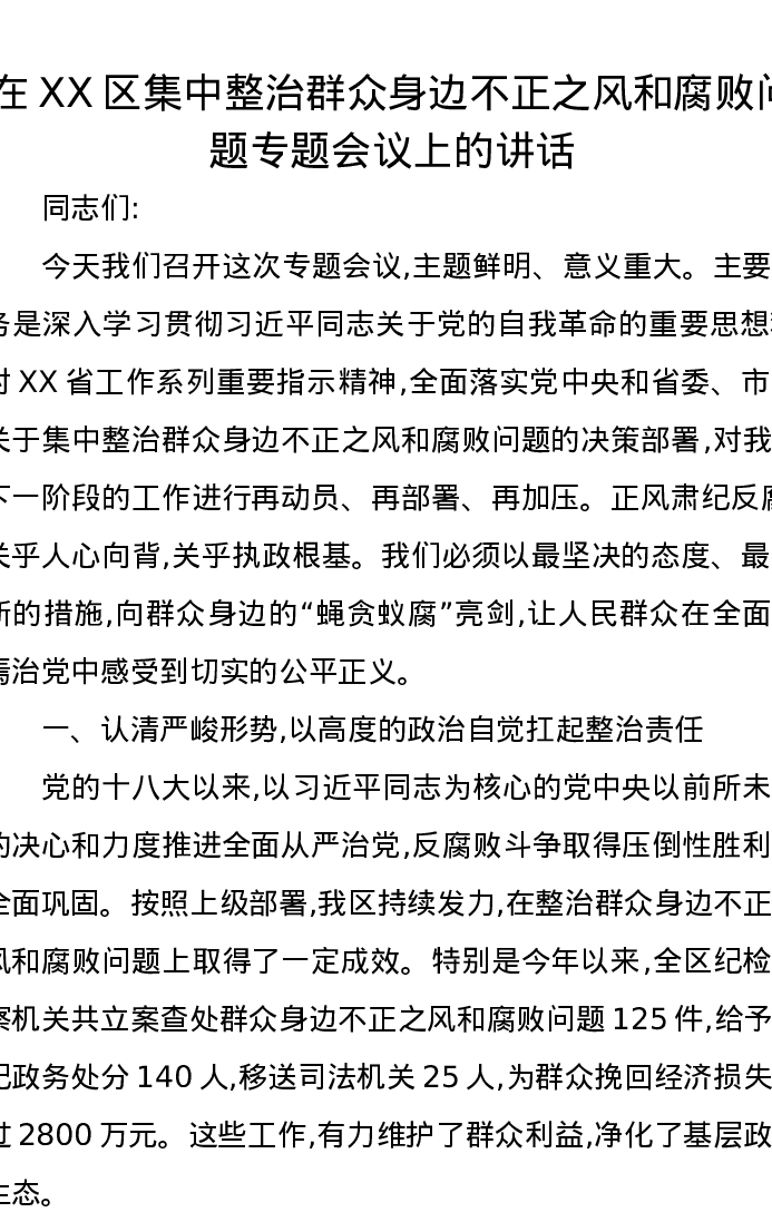 在XX区集中整治群众身边不正之风和腐败问题专题会议上的讲话