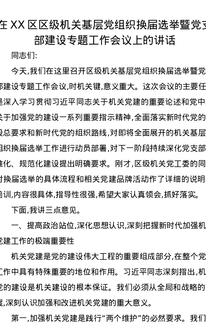 在XX区区级机关基层党组织换届选举暨党支部建设专题工作会议上的讲话