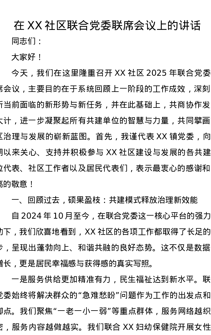 在XX社区联合党委联席会议上的讲话