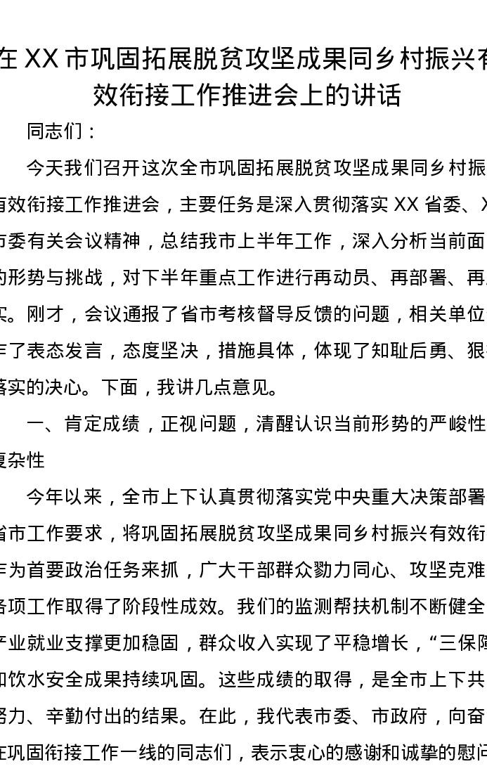 在XX市巩固拓展脱贫攻坚成果同乡村振兴有效衔接工作推进会上的讲话