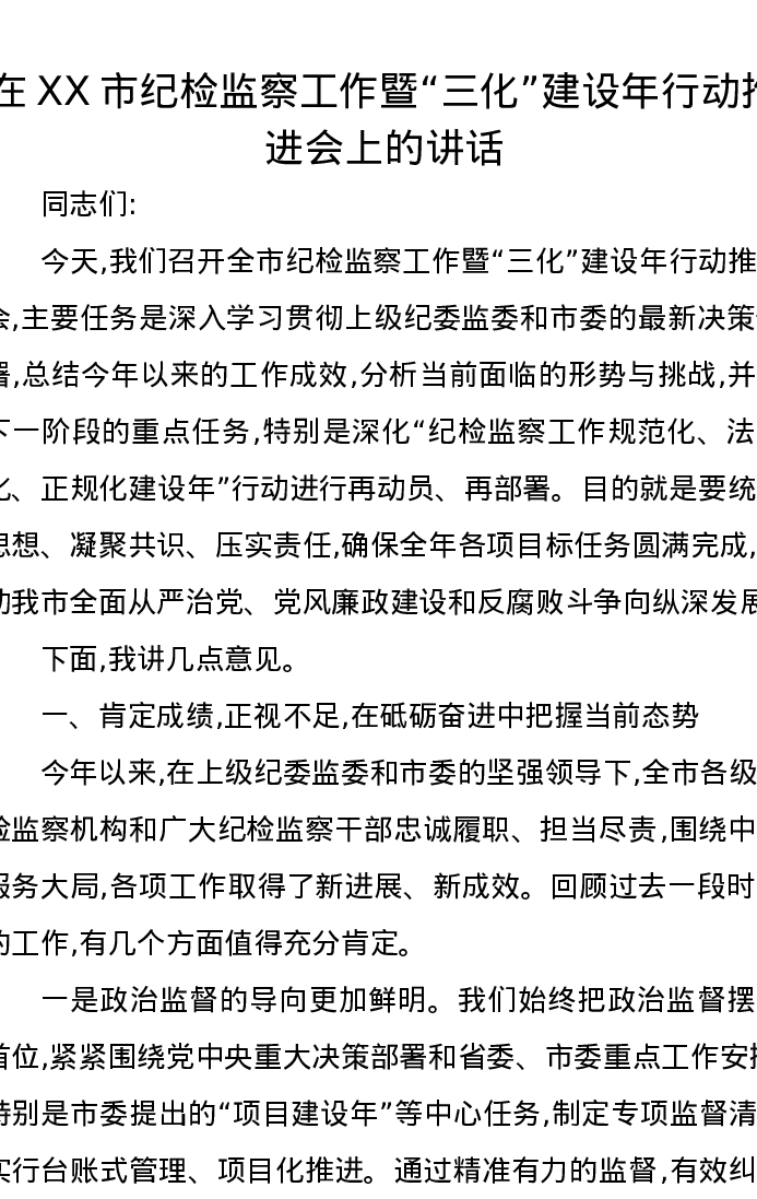 在XX市纪检监察工作暨“三化”建设年行动推进会上的讲话