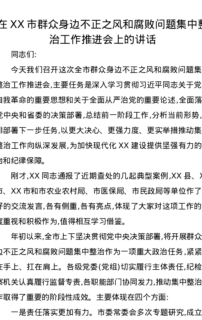 在XX市群众身边不正之风和腐败问题集中整治工作推进会上的讲话