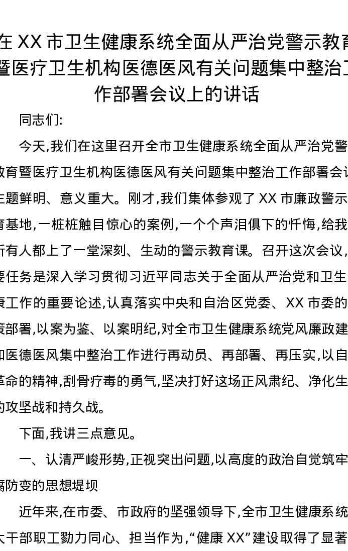 在XX市卫生健康系统全面从严治党警示教育暨医疗卫生机构医德医风有关问题集中整治工作部署会议上的讲话