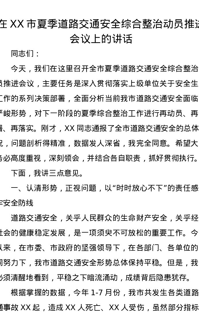 在XX市夏季道路交通安全综合整治动员推进会议上的讲话
